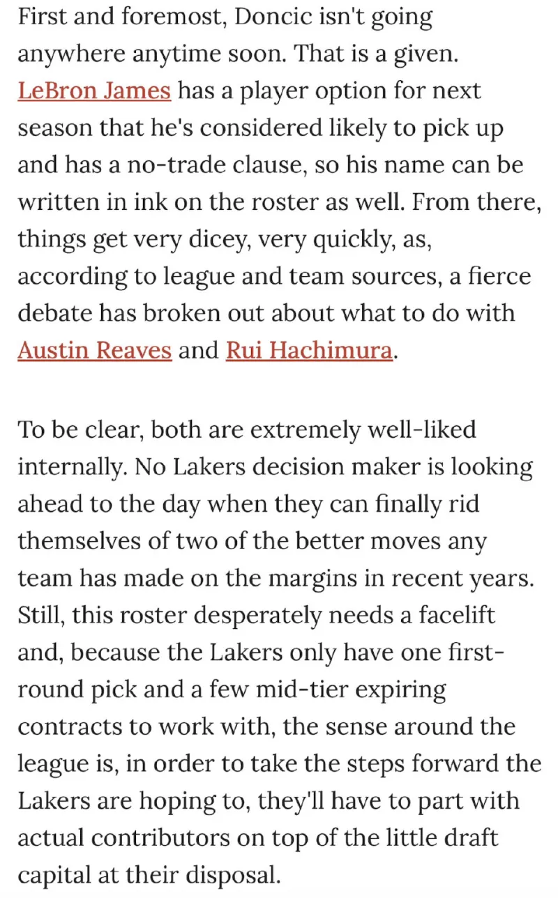 需要明确的是,这两位球员在队内都非常受欢迎。没有哪位湖人决策者希望摆脱这两个近年来表现出色的球员。然而,这个阵容迫切需要一次大换血,而湖人只有一个首轮选秀权和几个即将到期的中等合同可以操作。因此,外界普遍认为,为了实现湖人所期望的进步,他们必须放弃一些实际贡献者,同时还要动用手中有限的选秀资本。